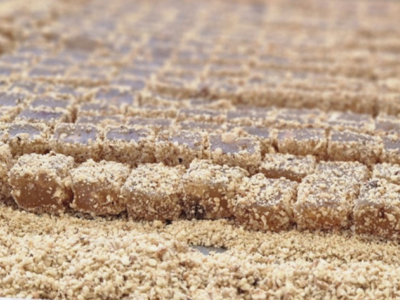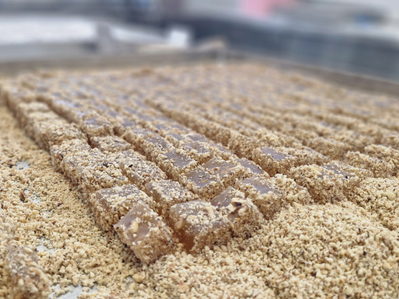 Sastav: šećer, voda, kukuruzni skrob, jezgro lešnika 10%, aroma pečenog lešnika.