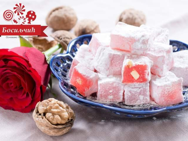 Tradicionalno ručno pripremljen ratluk sa orahom, svaka kocka se pravi sa puno pažnje i ljubavlju. Ima vrlo blagu aromu i nežan je na nepcima. Pakovan u kutiji.